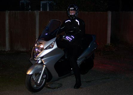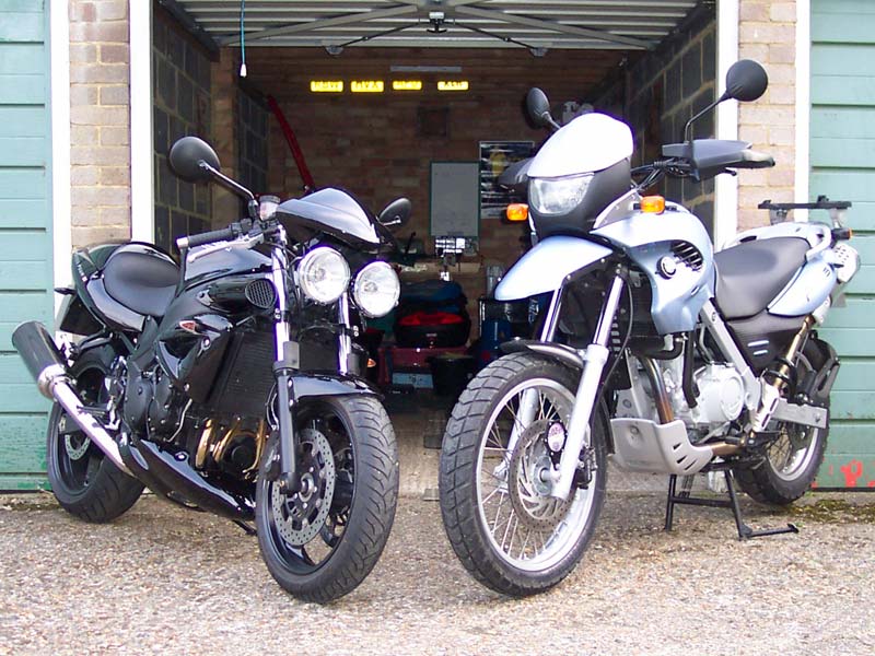 the running in, now I'm only limited by my ability ;-) Further update In short, this page needs a re-write. We have a new bike each on the way, Sally a Vespa, Graham a 'Silverwing' super-scooter. Graham won't be riding for a while though, see disaster. I really will get around to chopping some of this about, and updating it one day. Most of it's well out of date. We still have the Mini, but we're thinking of changing it, here's why. Ok, the Silverthing's gone. Now I don't have to ride 50 miles each way to go to work, I wanted to get something a little less barge like. So here's the current contents of my garage. We're gonna do a bit of touring on the BM, here it is packed up for a weekend in Suffolk. Won't be doing much filtering on that! I need to be a bit careful on the throttle too, I wheelied it on the A12 with all that luggage and Sally on the back! Try explaining that without saying "it's because of the extra weight with you on the back"! |